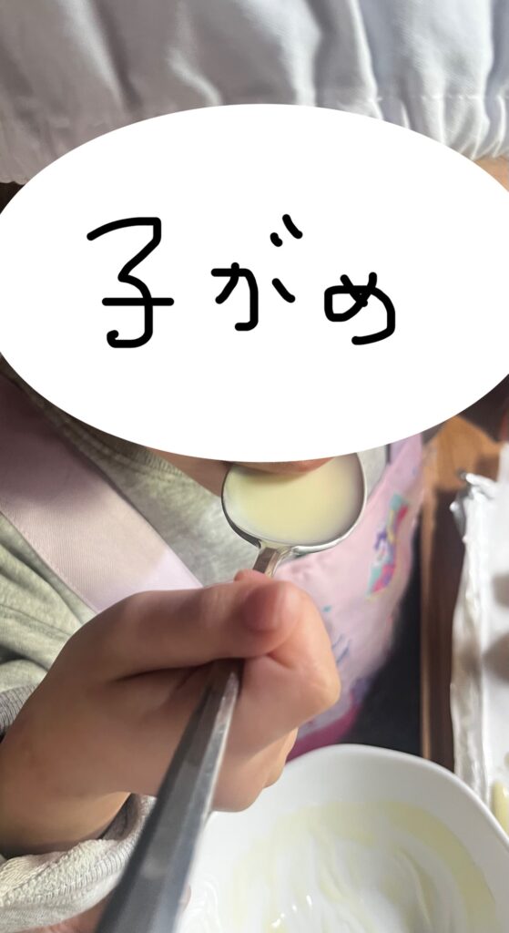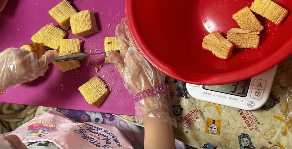 そして今回は前回とは違うスーパーに行って、ホールのバームクーヘンをGETできたので子がめに量りながら入れたいからカットしてねと伝え、ぴったり分量の240gになるようにお願いしました。