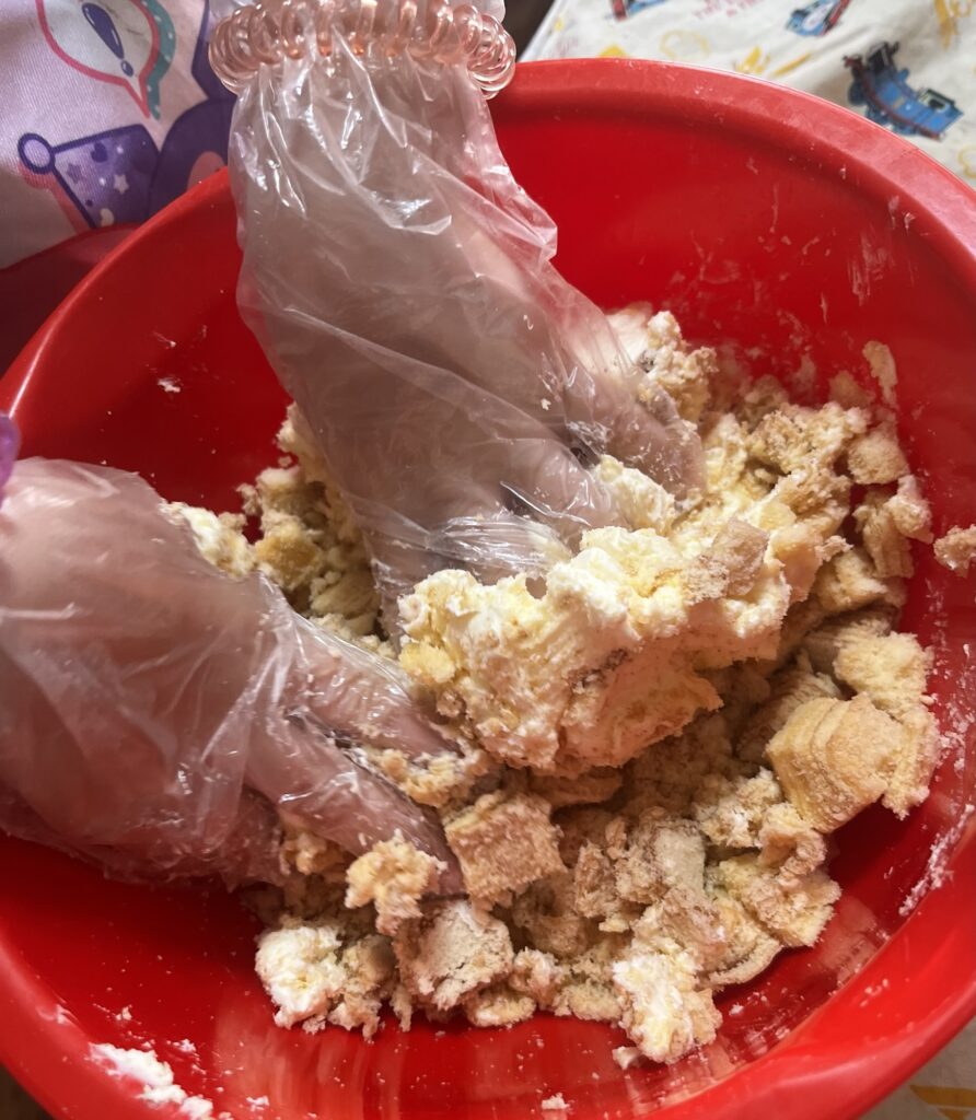 そして、冷蔵庫で一旦休ませるからと手袋を取ってしまっていたので・・・