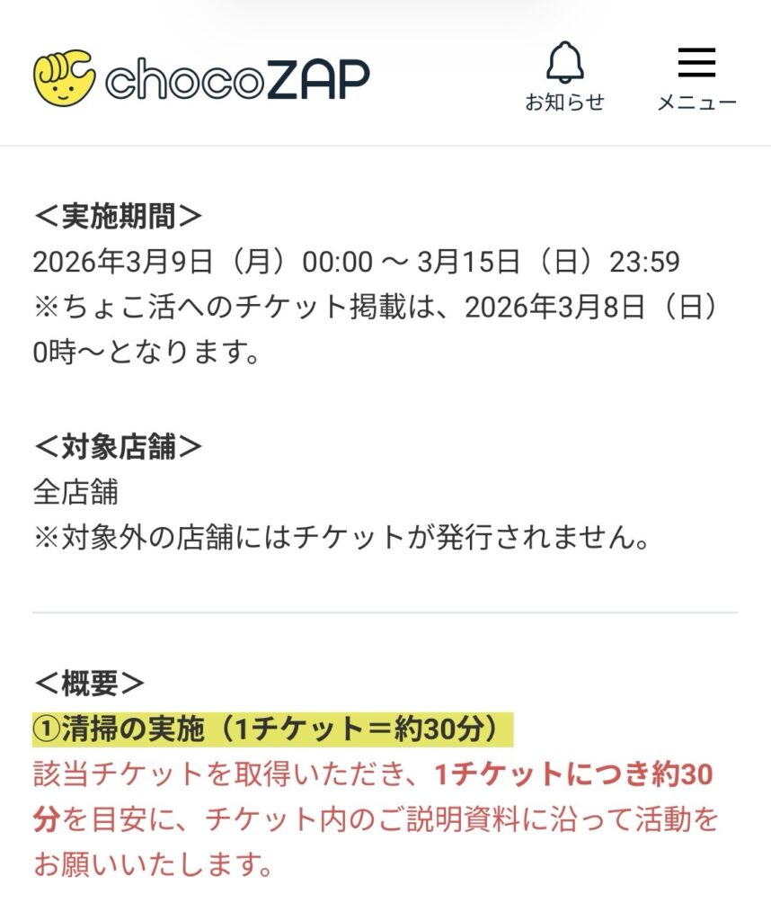 昨年(2025年)12月から発行されるようになったchocoZAPフレンドリー会員用の大掃除チケット。