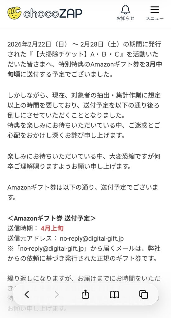 12月、2月と活動して、12月のAmazonギフト券がなかなか送られてこずに、大掃除の活動も報告も問題がないと思っていたところの、3ヵ月遅れでまさかまさかの対象外判定の判明だったので・・・