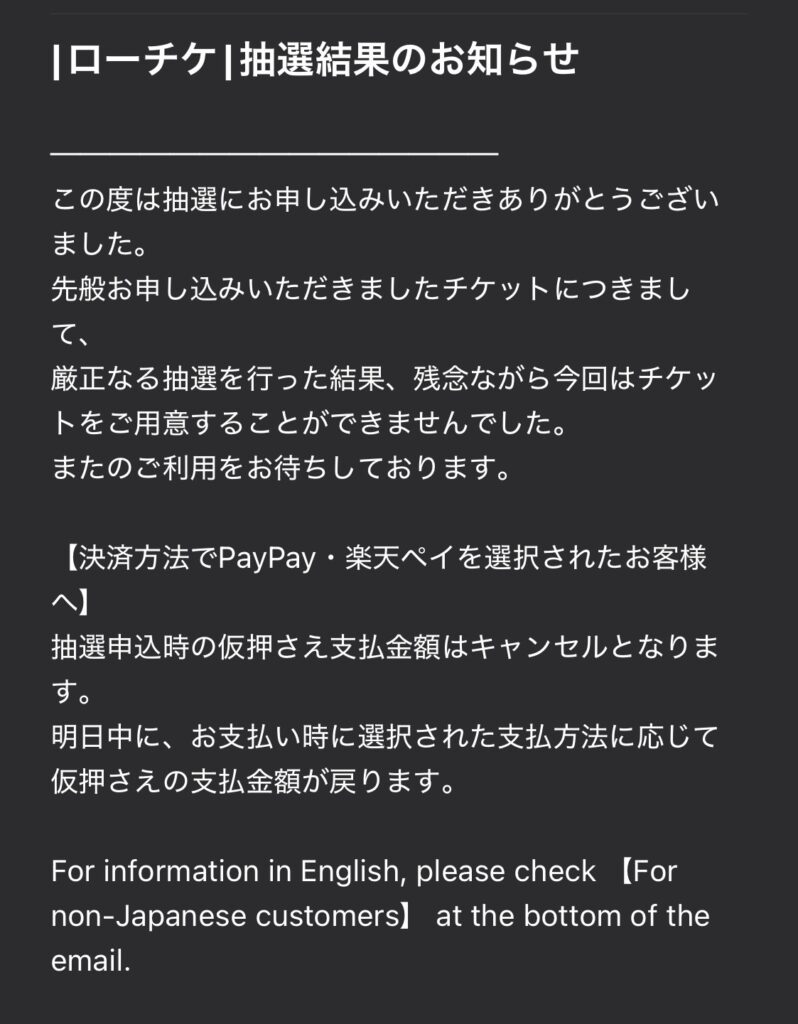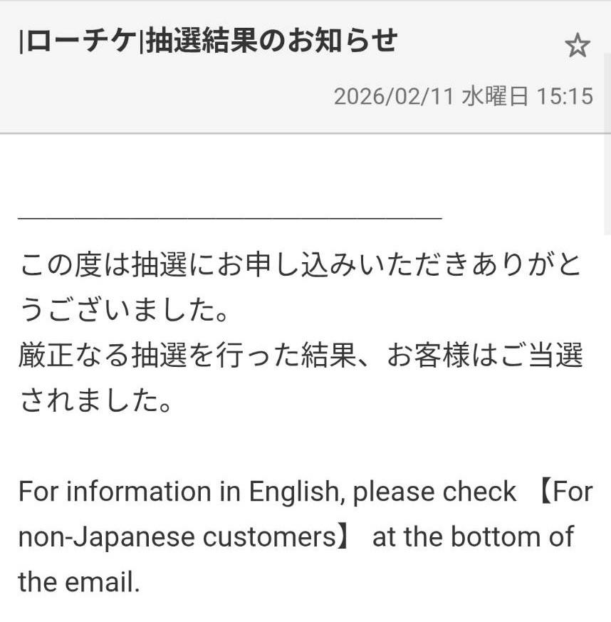 それにしても、15:11にローチケからメールでも抽選結果のお知らせが来たのですが・・・『厳正なる抽選の結果』で残念な結果となったらしい私。