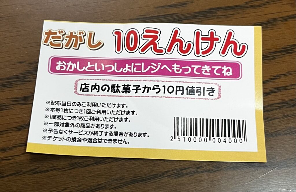 ファンタジーキッズでは入場時に駄菓子割引券をもらえて『お会計から10円引き』になるのですが・・・今回私がそれをすっかり忘れてしまいました・・・