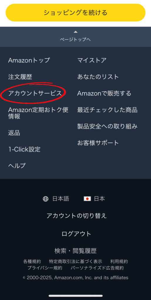 ➁一番下にスクロールして「アカウントサービス」をクリック