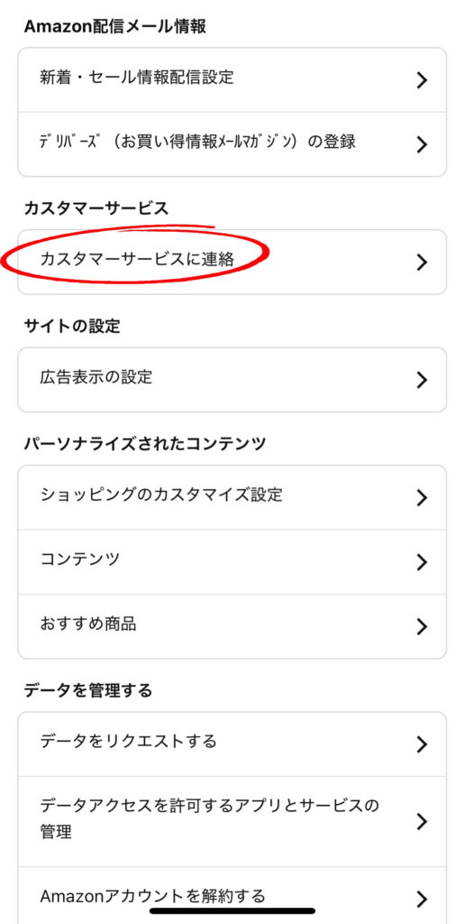 ③中央より少し下の「カスタマーサービスに連絡」をクリック