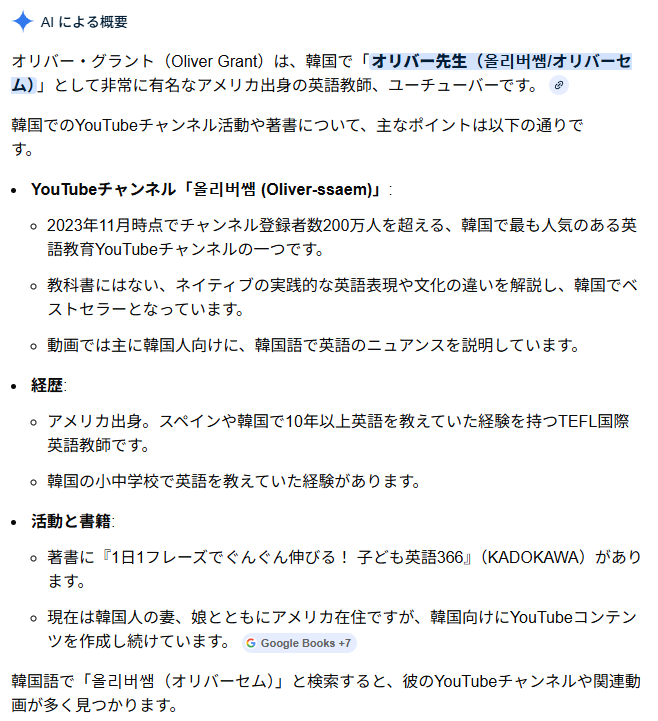 そして、よくよく確認すると、本のタイトルを調べた際のAIさんの著者の要約では『”オリバー先生”としてYouTubeで活動されています』と。