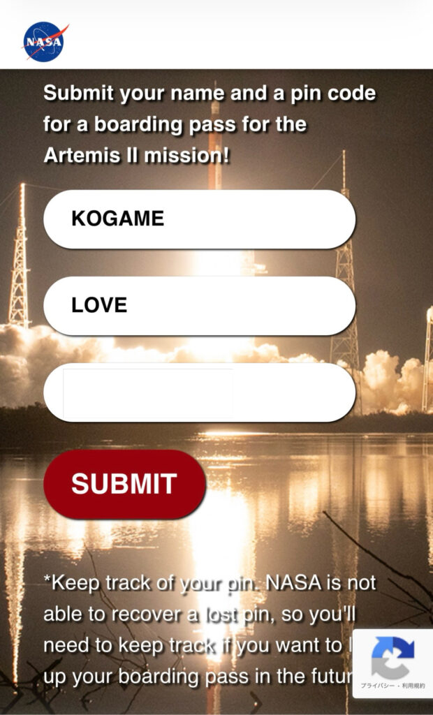 このキャンペーンは、NASA公式のもので、ホームページの指定ページに名前とピンコードを入力すると、そのデータを実際に打ち上げるアルテミスIIに乗せて月に向かってくれるというものだそうです。