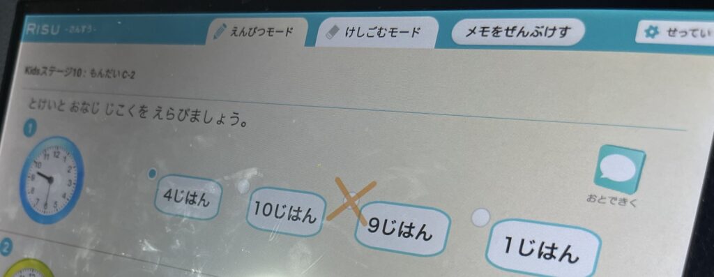 そこで当たればよれはそれで良しだし、ハズレたとして、ここがミソなのですが、RISUキッズさんのタブレットの仕様だと、誤った回答をした際には、問題に『〇』が付かずに『×』がつくのですが、その『×印』が正しい答えのところに表示される、ということでした。