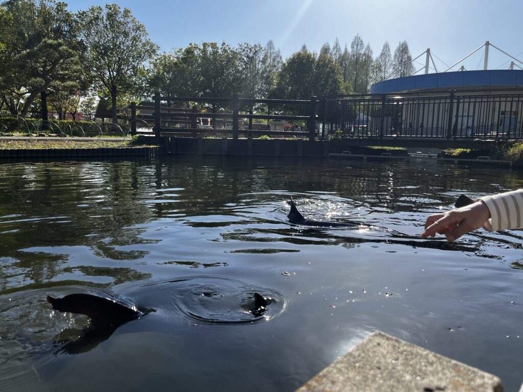 ガラス張りエリアとは別に、池の中心に向かって岬のようになっているエサやりエリアもあるのですが・・・