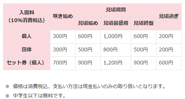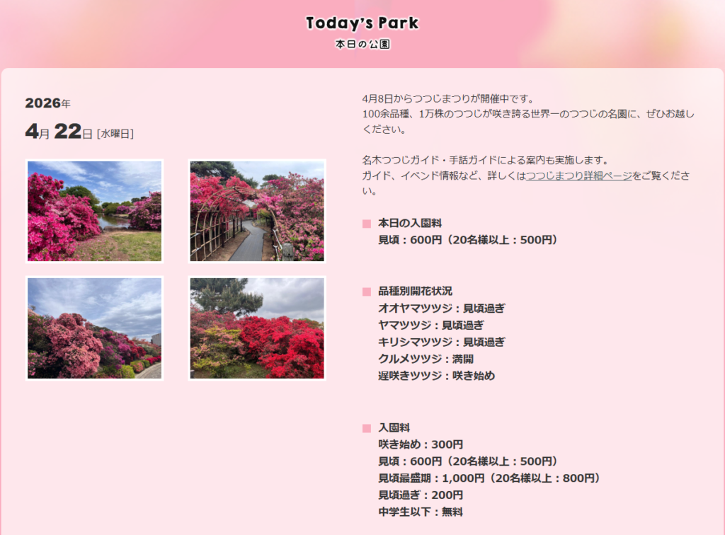 そして、毎日公式HPで品種ごとに開花状況(写真付き)やそれに付随した入園料がUPされています。