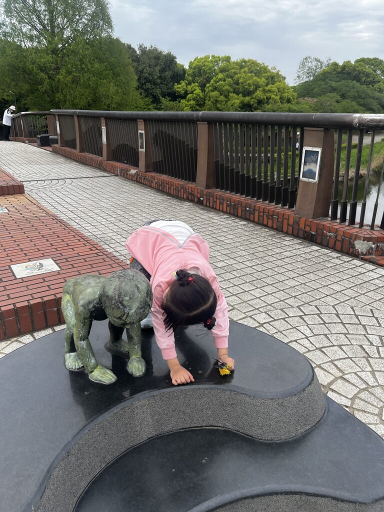 我が子は、毎年お会いする橋の上の銅像さんと戯れていらっしゃいました(笑