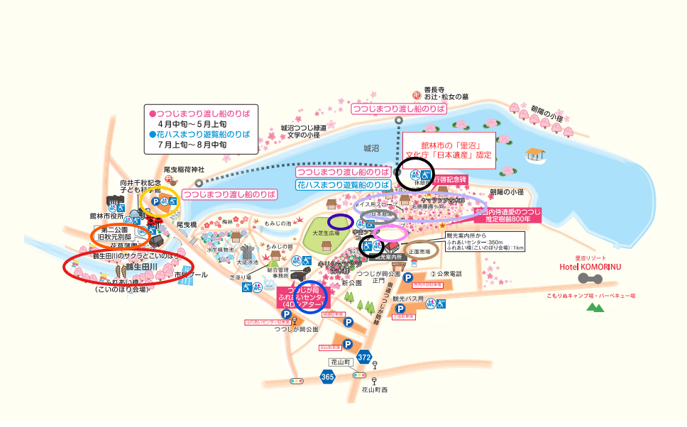 つつじまつりエリアからは少し距離がありましたが、こいのぼり(赤色丸印)や冒険エリア(オレンジ色丸印)から近く、結果的には良い導線となりました。