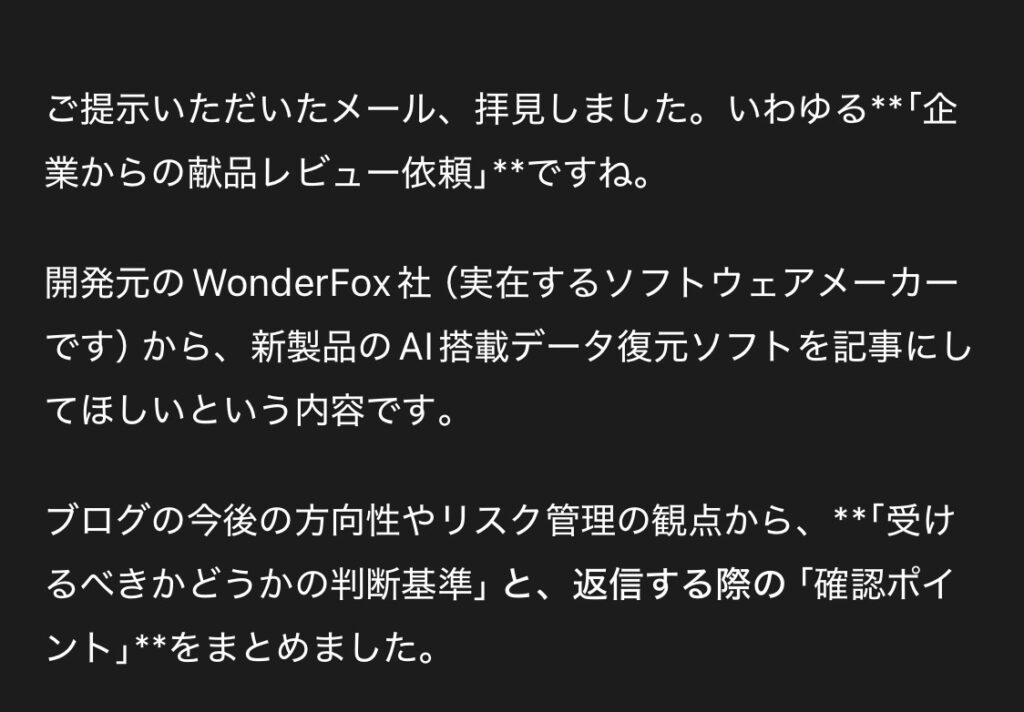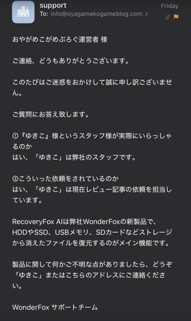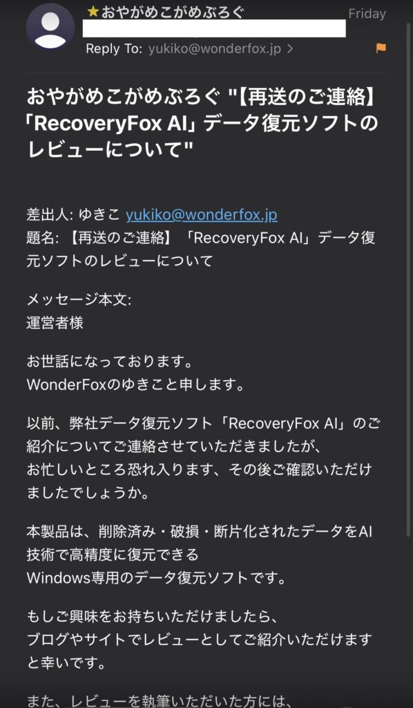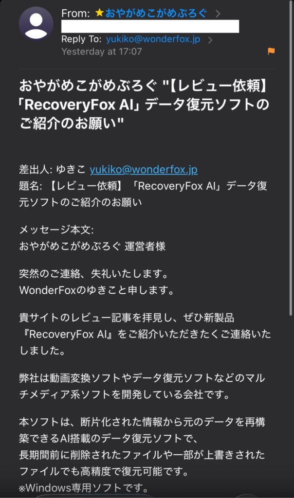先日、『WonderFoxのゆきこ』と名乗る方からブログのお問い合わせフォームを通じてレビュー記事の依頼がきました。